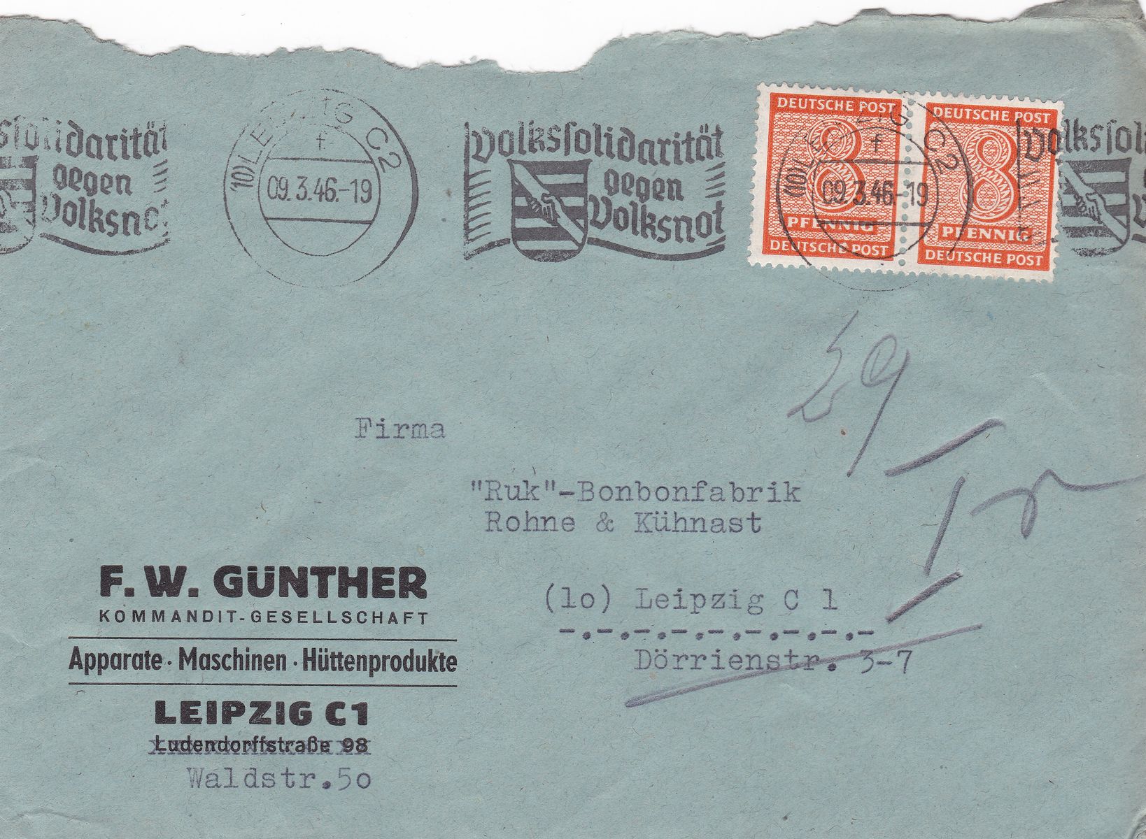 Der erste Beleg ist ein Geschäftsbrief von Magdeburg vermutlich nach Leipzig. Nahezu alle Briefe meines Fundes gingen nach Leipzig. Da es sich aber um einen Fensterbriefumschlag handelt, kann das nicht geklärt werden. Der Beleg ist mit einer Mi 71 frankiert. Der Abschlag erfolgte am 15.11.1945. Die Marke weist m.E. den Plattenfehler 71II auf. Da ich aber keinen Vergleich gefunden habe, hoffe ich, dass ein Experte aus dem Forum dazu erhellende Informationen beitragen kann. Gemäß meinem Michel spezial 2008 wird dieser Plattenfehler, gestempelt, mit 450,00 € bewertet, für die Bewertung eines Beleges mit dieser Marke schweigt er sich aber aus.