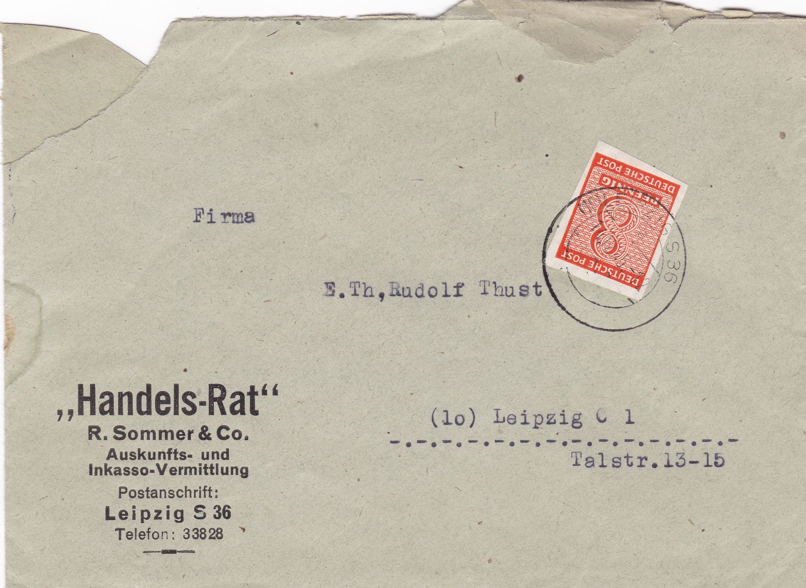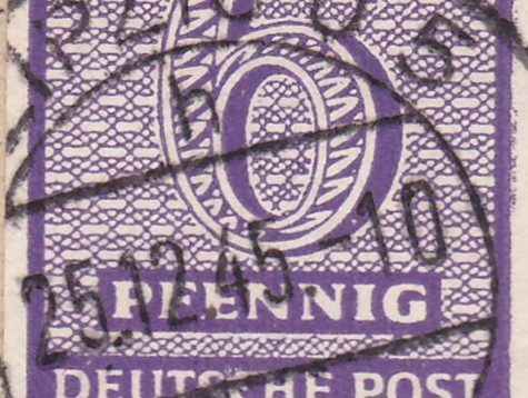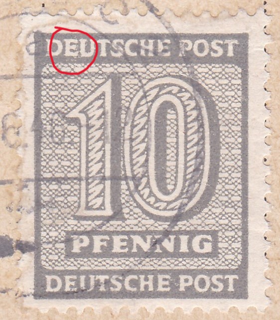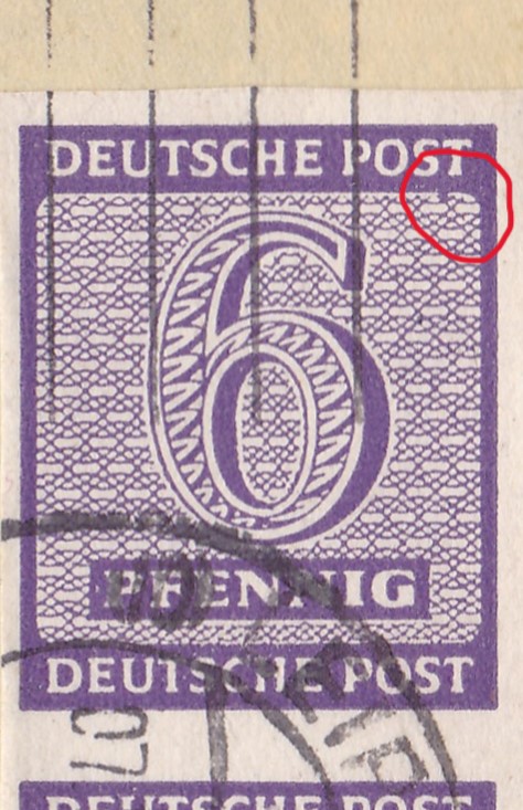 Die Besonderheit an dieser Mi 71 besteht darin, dass es sich wahrscheinlich um eine Postmeistertrennung handelt. Ich würde die Marke als eine Mi 71XD einordnen. Dagegen spricht, dass der Abschlag des Beleges nicht in Halle 8, sondern in Halle 4 erfolgte. Es könnte sich daher auch um eine Privattrennung handeln, umso mehr da der Absender ein Stromversorger ist, Stromversorger haben einen hohen Umsatz an Geschäftspost und könnten eigene Trenntechniken eingesetzt haben.