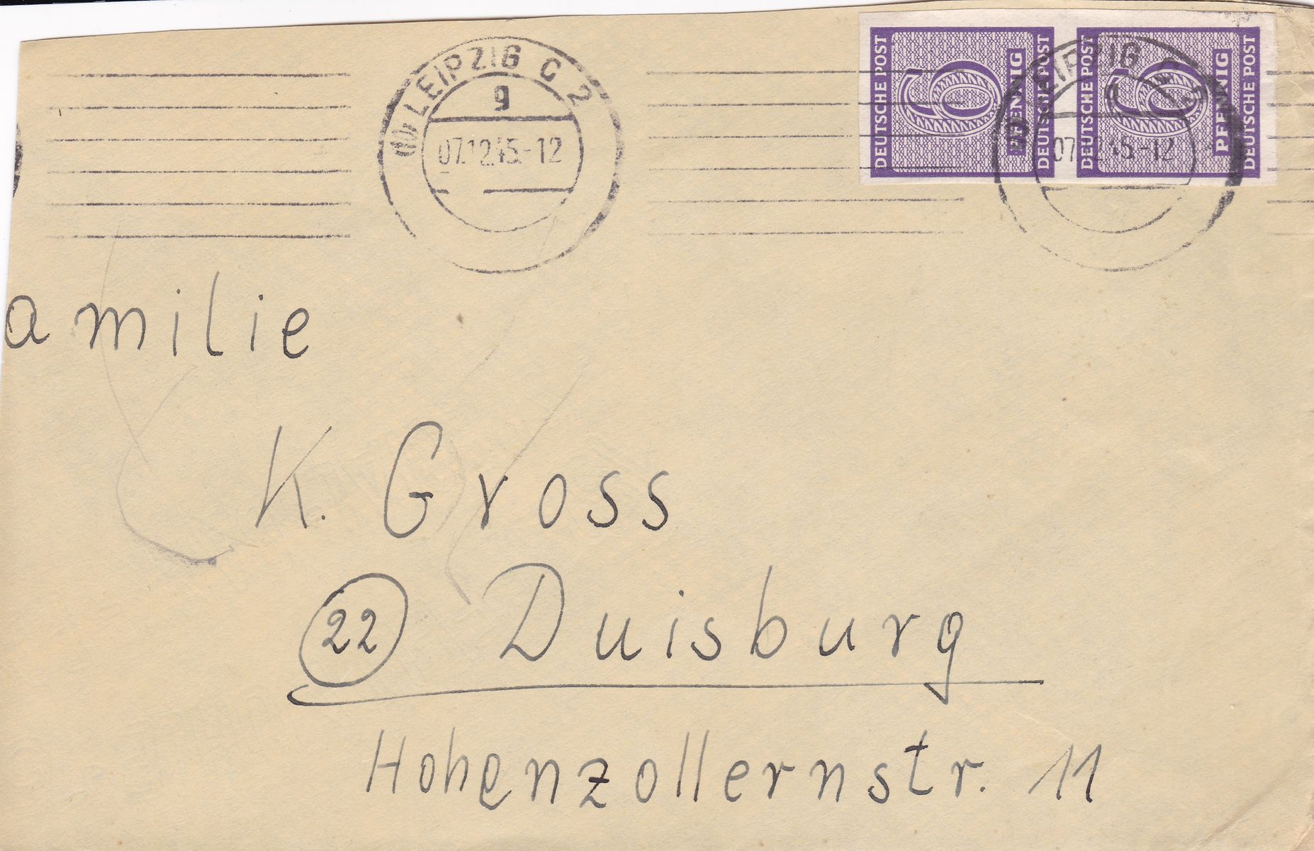 Der zweite Beleg ist ebenfalls mit einer Mi 71 frankiert. Er ist in Halle am 12.11.1945 abgeschlagen worden. Auch hier handelt es sich um einen Fensterumschlag.