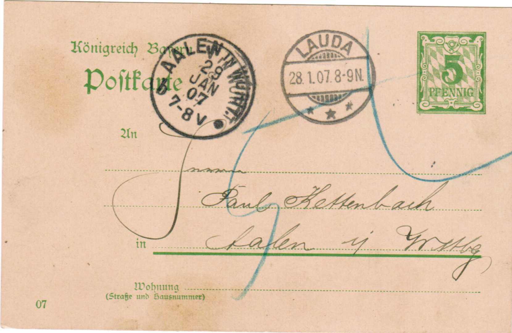hier mal eine bayrische Ganzsache die unerlaubt in Würtenberg verwendet wurde und folgerichtig mit Nachgebühr belegt.