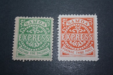 Samoa Express - AGAR Privatpost von 1877: 1 Penny blau, 2 Pence rosa, 5 Shilling grün.