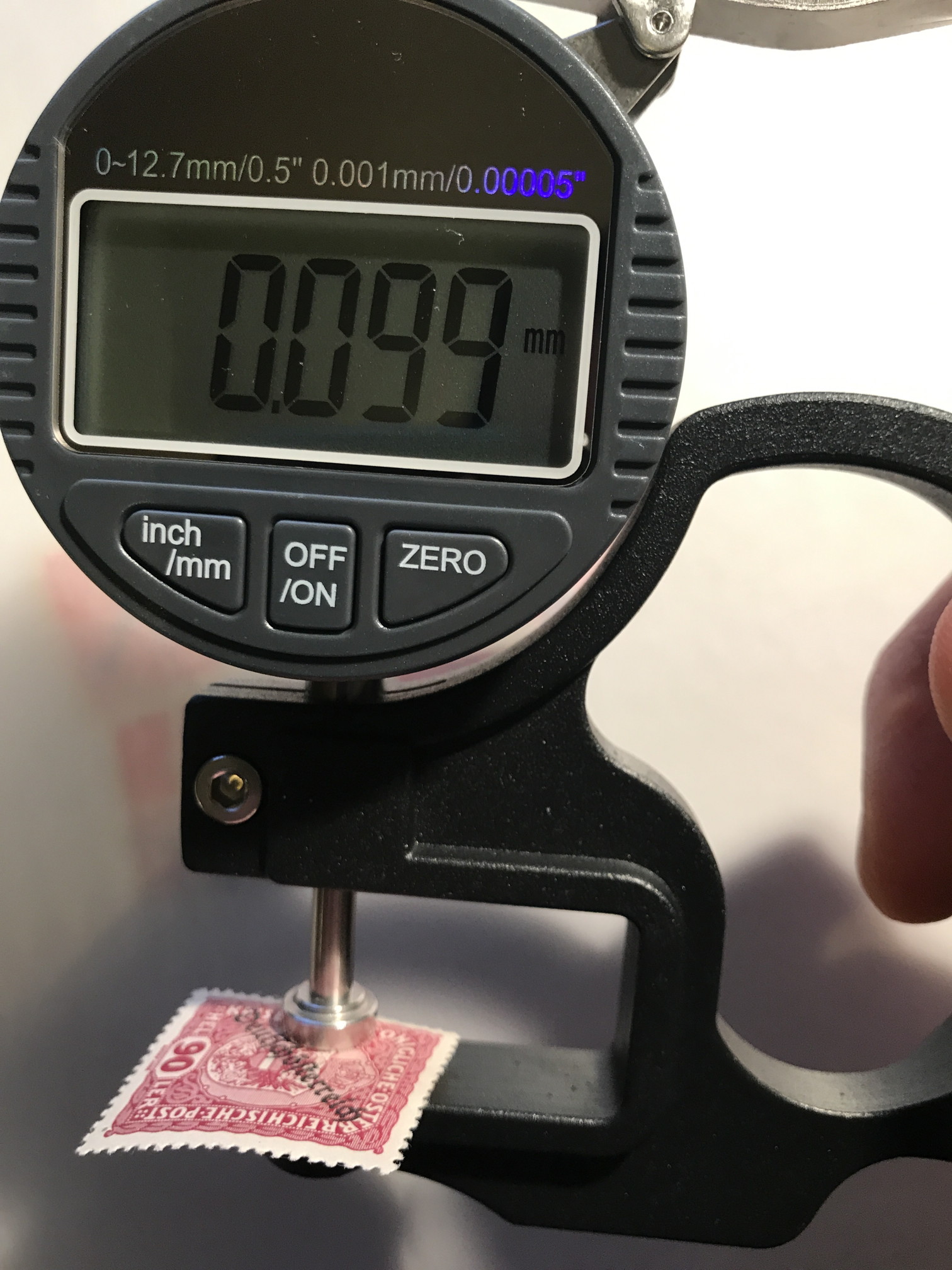 Hier mal zwei Fotos des Dickemessgeräts. Chinesisches Produkt, Beschreibung auf Chinesisch, aber intuitiv. Die fragliche Briefmarke hab ich auf dem Foto eingeklemmt. Je nachdem wo man misst, bekommt man unterschiedliche Ergebnisse.