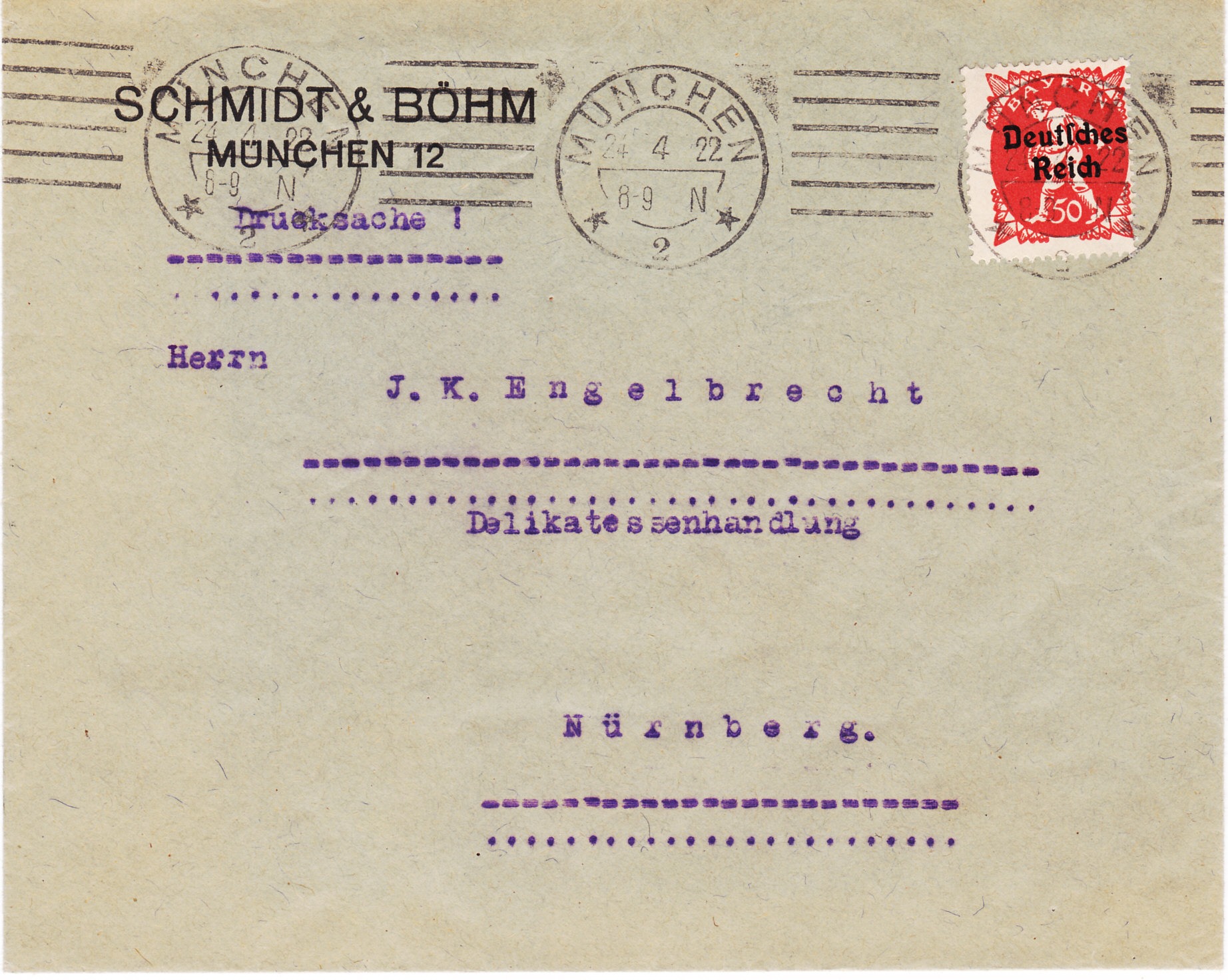 Deutsches Reich Inflation, 50 Pf. Bayern Abschied, Mi. Nr. 125 Frankensimon 16. August 2024 um 09:53 Hallo Zusammen,Beleg vom 24.04.22 von München nach NürnbergDrucksacheGruß Frankensimon