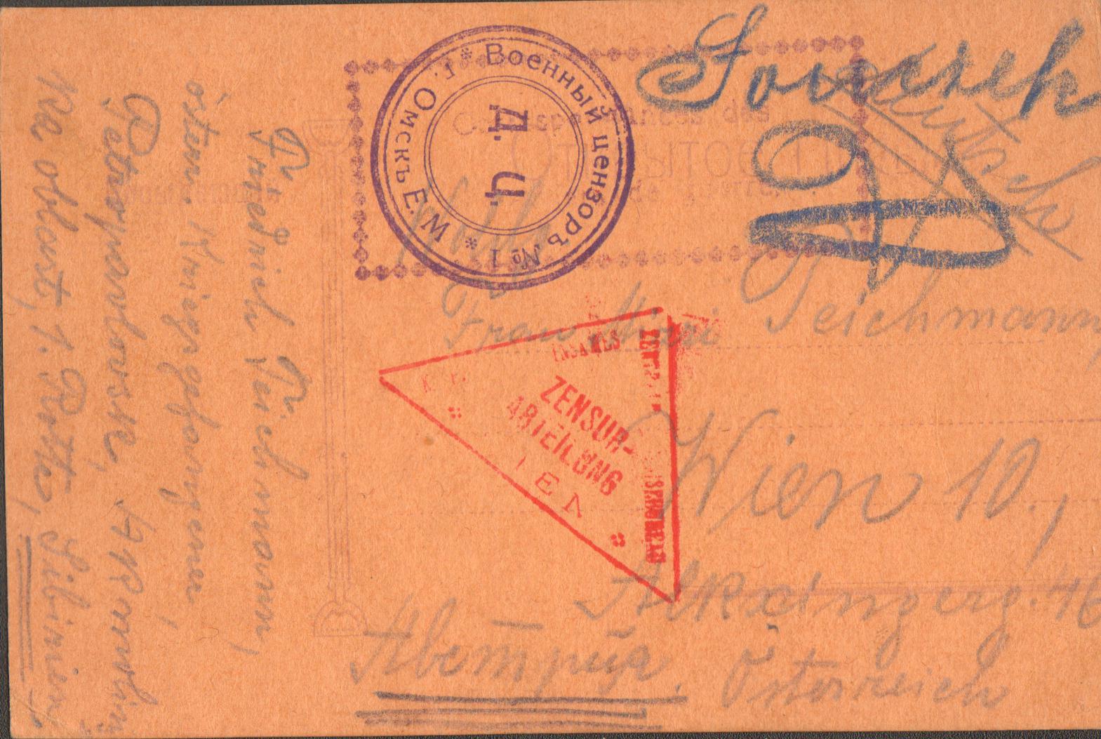 Bisher nicht bekannt sind die Initialen "М. Ш." = M. Sch. des Typ 20. Hier auf einem Kriegsgefangenenvordruck aus Barnaul dessen Druck überwiegend in französisch (Sprache des Weltpostvereins) gehalten ist. Der eckige Rahmenstempel ist ein Hinweisstempel zur Kriegsgefangenenpost - ungewöhnlich ist darin die Nennung des Lagers. Abgeschlagen wurde er in der Lagerkanzlei. Der kopfstehende große rote Eingangsstempel des GZNB in Wien ist nicht häufig, da nur drei Monate in Gebrauch (9.15-12.15).