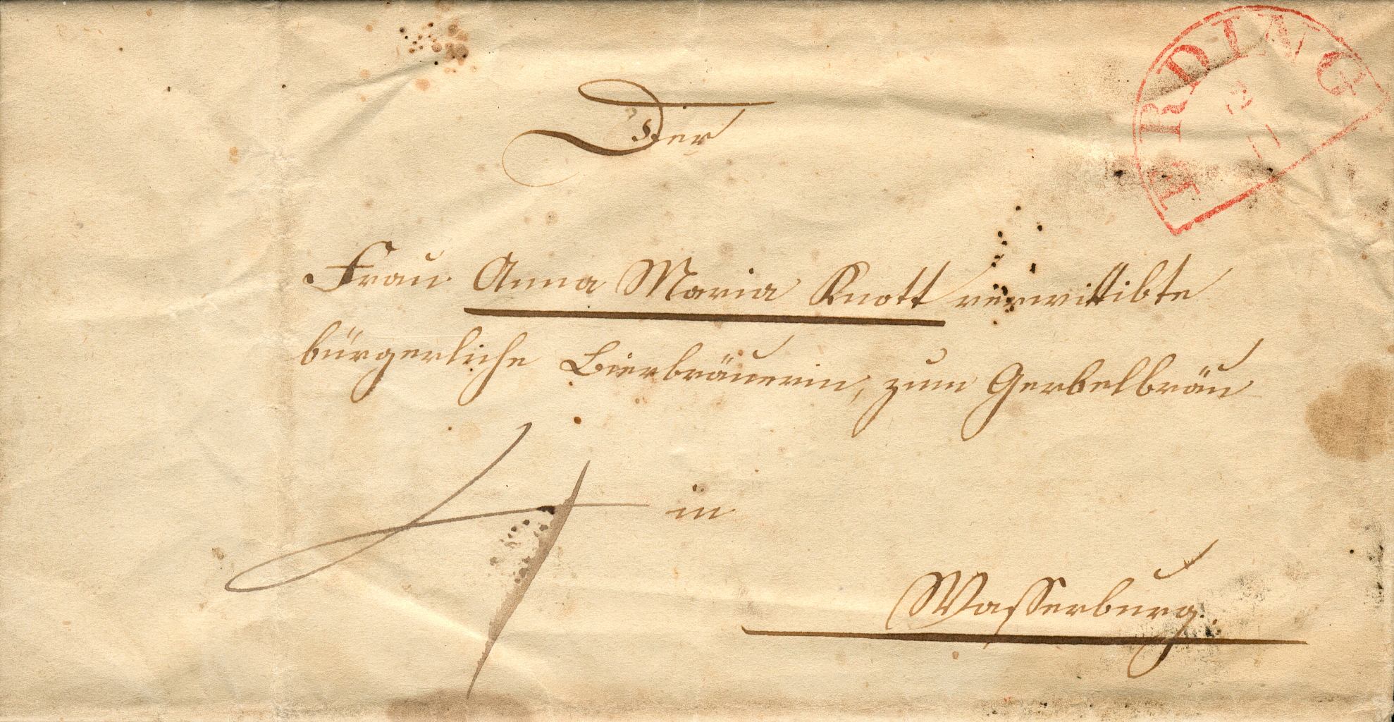 In diesem 1844 in Starzell geschriebenen und in Erding aufgegebenen Schreiben bittet eine Braut ihre Patin zur baldigen Hochzeit. Angesichts dieser frohen Botschaft war es der Adressatin (Brauerwitwen darbten selten) sicher eine Freude, vier Kreuzer für einen einfachen Brief der zweiten Entfernungsstufe zu bezahlen.