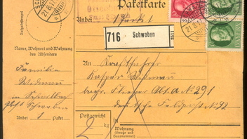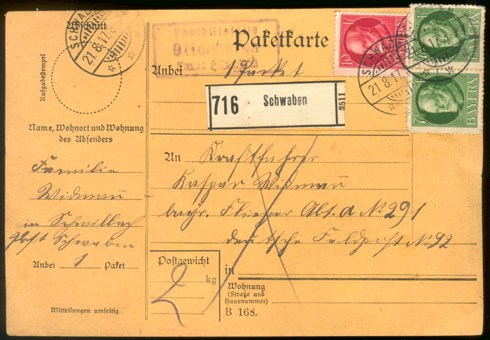 Paketkarte für ein Soldatenpaket bis 5 kg, aufgegeben bei der Posthilfstelle Ottenhofen, Taxe Schwaben (mit entsprechendem Stempel Helbig Typ 2), freigemacht mit Nr. 114 und 2mal Nr. 113, entwertet in Schwaben am 21.8.1917. Paketkarten von Posthilfstellen sind nicht häufig.