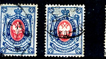 Nun zu meiner Frage, die ersten drei Marken (von links nach rechts) sind die "normalen" Marken, die Marke ganz rechts hat oben, jeweils links und rechts neben dem oberen 14 Kopeken Werteindruck, einen kleinen Kreis mit einem Punkt.