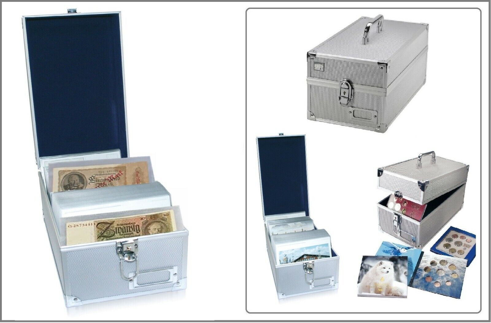 Ich habe auch diese Problematik, allerdings mit Ansichtkarten bzw. auch Banknoten. Jede Ansichjtskarte bzw. Banknote befindet sich in einer Schutz-Folie. Hier habe ich für alle eine einheitliche Größe. Sieht zwar bei einigen kleineren Exemplaren nicht soooo optimal aus, aber der Gesamteindruck bleibt gleich schön. Ich habe mich bei Ansichtskarten für die Sortierung Herkunft nach Alphabet und als Untergruppe nach Datum entschieden. Es gibt diese Sammel-Alukoffer in allen Größen. Hier nur mal ein Beispiel. Ich habe da ziemlich Große. Dafür passend gibt es Registerkarten, nach Alphabet, Nummern oder selbst beschriften. Ist für mich die übersichtlichste Variante. Schukartons, bzw. andere Behältnisse auch Kartonagen hatte ich auch am Anfang. Die sehen dann irgendwann "unschön" aus. Die Alukoffer sind immer eine einmalige Anschaffung und wenn Du größere wählst, kannst Du auch (systemabhängig) schon mittels Steckprofile auf Deine gewünschten Maße anpassen.
