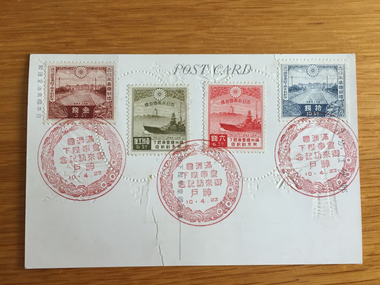 Jetzt konnte ich mir doch noch was ergoogeln. Der Herr links ist Puyi, letzter Kaiser v. China. Die Marken auf der Rückseite sind anlässlich dessen Besuchs 1935 in Japan.