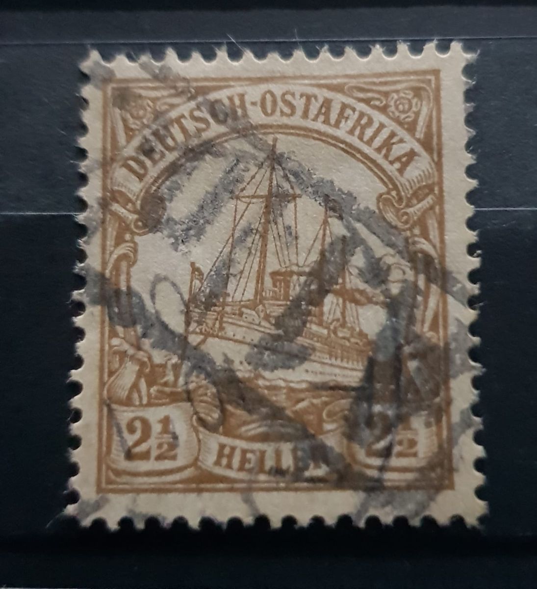 Eine im ostafrikanischen Tanga abgestempelte 2,5h-Marke besitzt noch einen zusätzlichen dicken Über-Stempel ... ich sehe nur "A.1" und danach fragliche Buchstaben/Ziffern in einem eckigen Stempel ... ich vermute, vielleicht ein Stempel der Bahn, die das Poststück transportiert hat. Ein Stempelkatalog habe ich bereits zu Rate gezogen, leider ohne Erfolg.