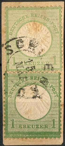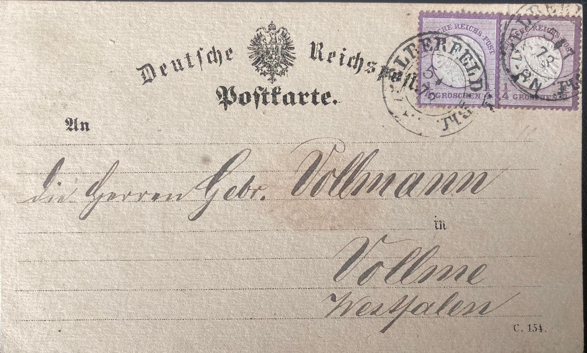 Hier eine Karte mit Mi-Nr. 1 in Kombination mit Mi-Nr. 16 von Elberfeld nach Vollme, mit Stempel Elberfeld Bhf. vom 5.7.1873. Das Postkartenporto von 1/2 Groschen durch zwei Werte der 1/4 Groschen dargestellt.