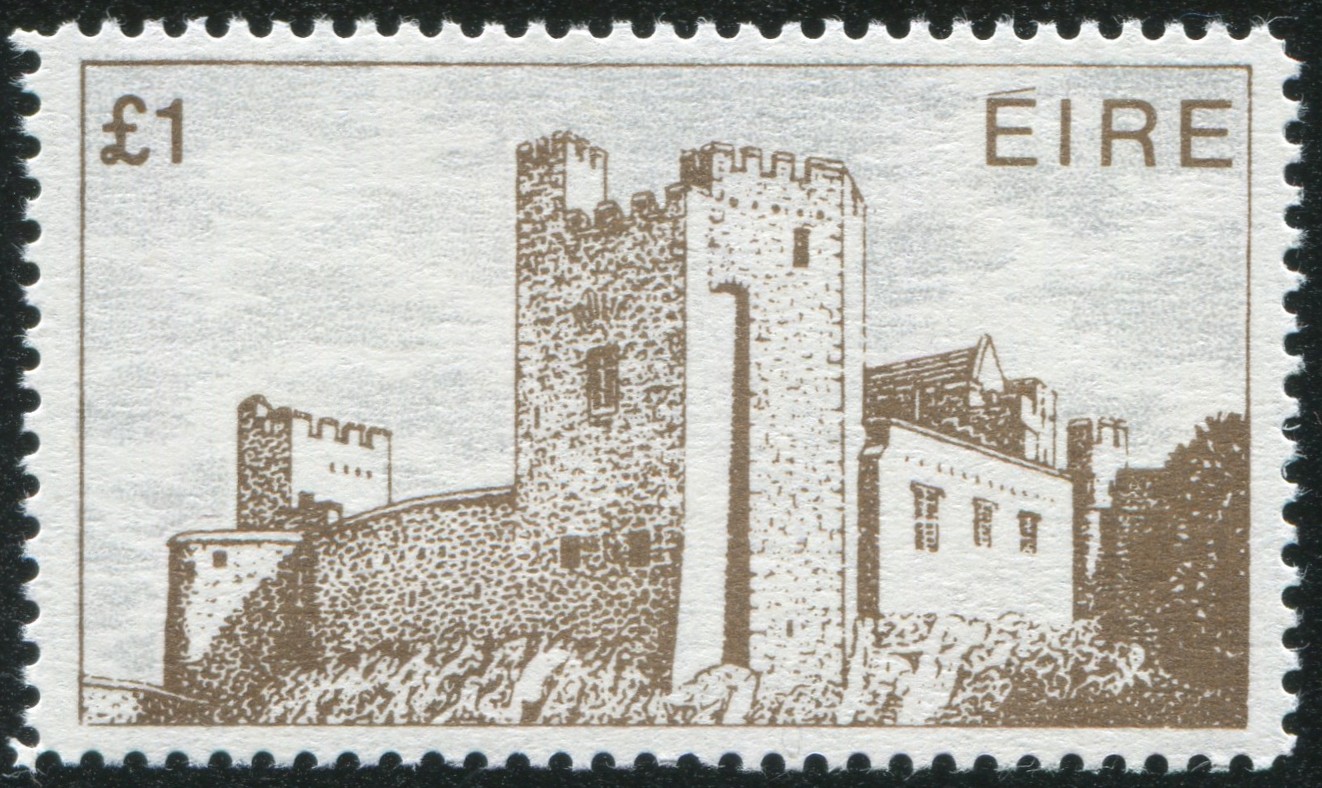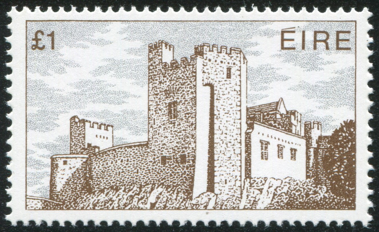 Von der 1982 herausgegebenen Dauerserie "Irische Architektur" der irischen Post wurde sehr bald die 1£-Marke (MiNr. 502A) zum Schaden der Post gefälscht.