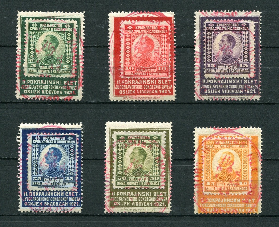 Anlässlich des 2. Falkentreffens der jugoslawischen Sokol-Allianz (II. Pokrajinski Slet Jugoslavenskog Sokolskog Savesa) in Osijek am 15. Juni 1921* gab es allerlei Souvenirs, unter anderem die sechs abgebildeten Vignetten, passend zu den darauf geklebten Marken (ex MiNr. 146/53) und mit einem wohl nicht postalischen Sonderstempel versehen.