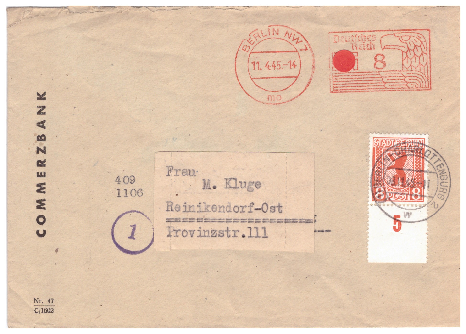 und der dann nach Kriegsende am 8.11.45 mit unbeanstandetem PFS D-6 wiederverwendet wurde für eine zweite Sendung , einen Ortsbrief von Berlin-Charlottenburg, UB w, nach Berlin Reini(c)kendorf-Ost, freigemacht mit Mi 3A.