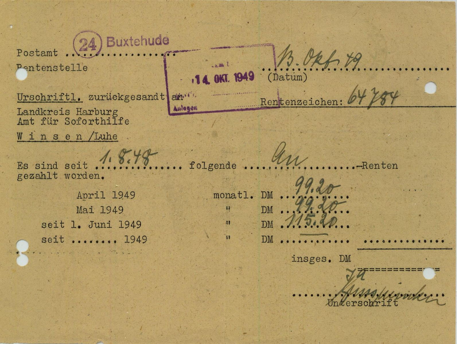 nachstehend eine Rentenberechnung des Postamtes Buxtehude. Wenn einem Rentenempfänger auch noch eine Soforthilfe zustand, musste er auf einem Formblatt die Höhe seiner Rente aufführen und bei der Rentenzahlungsstelle seines Postamtes vorlegen. Die Schreibgebühr betrug 20 Pfg und wurde mit Postwertzeichen ausgewiesen.