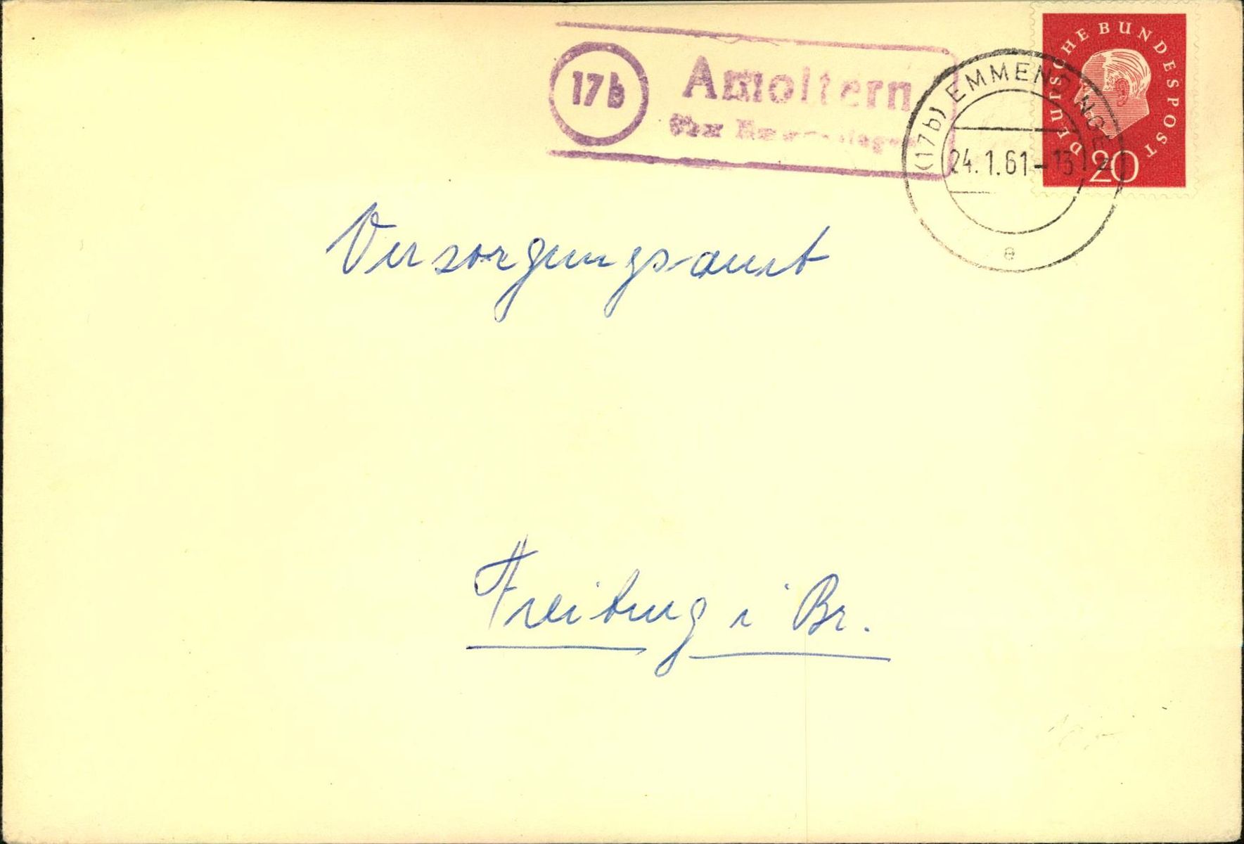 Ich habe von der PSt II Amoltern nur ein paar Belege. Zwei möchte ich zeigen. Das Leitpostamt war Emmendingen.