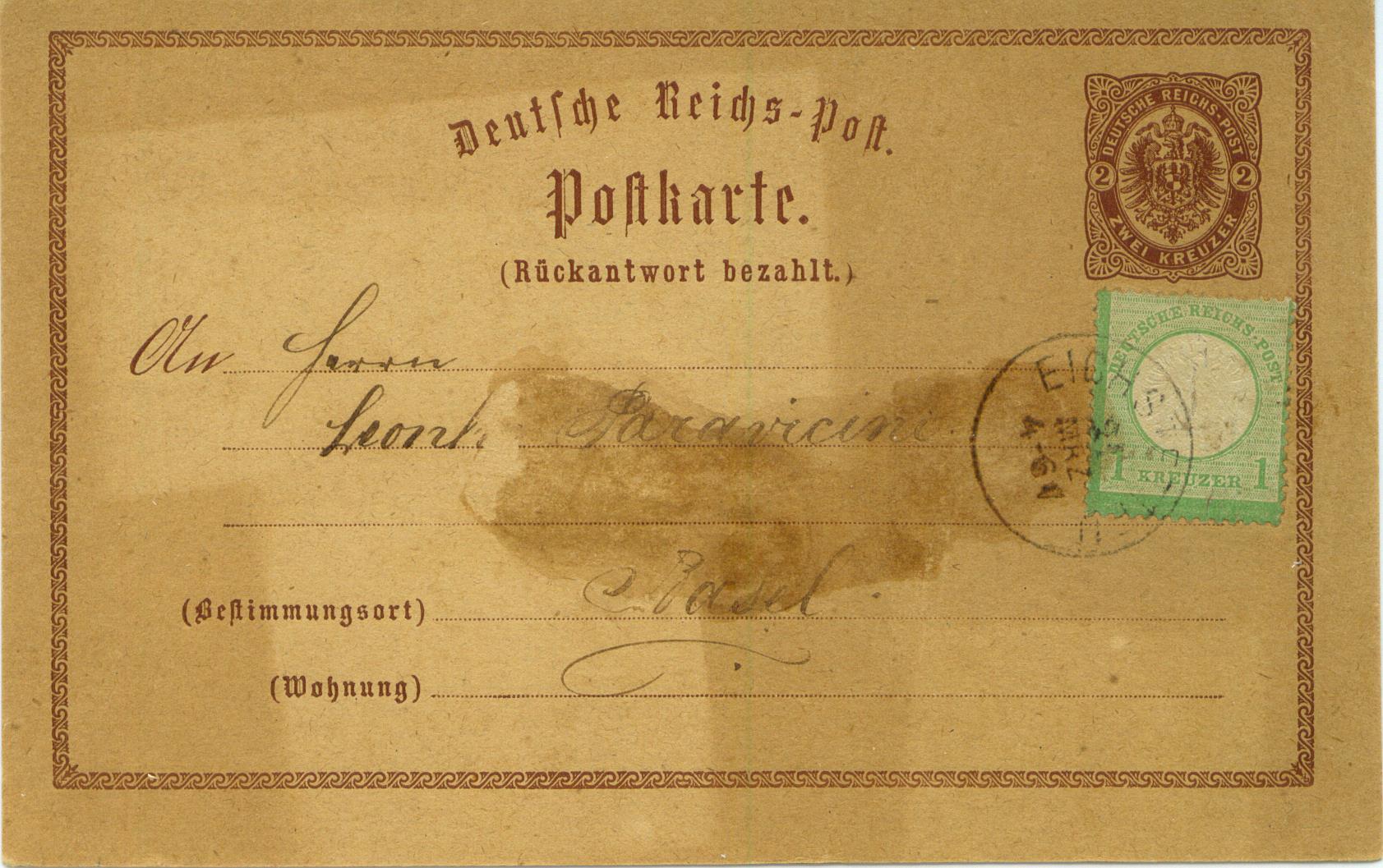 Dann noch eine Ganzsache aus der späten Phase der Postablage nach Breslau vom 30.04.1868. Nebe dem Postablagestempel ist auch der K2-Ortsstempel von Emmendingen abgeschlagen.