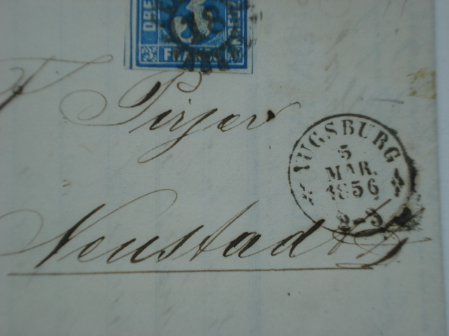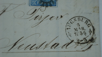Eine Mithilfe zu einem Brief aus Augsburg bräuchte ich auch noch: welches Neustadt ist bei dem Brief gemeint (das Kürzel hinter Neustadt kann ich nicht deuten). In Bayern kenne ich mich nicht so gut aus, aber es müßte bis zu 12 Meilen (90 km) von Augsburg entfernt liegen. Ist es N. an der Donau oder kommt noch ein anderes Neustadt in Frage?