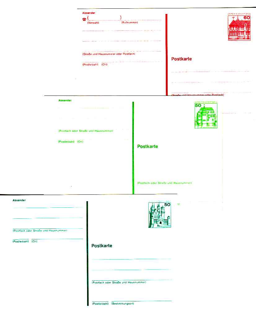 In Berlin gab es die gleiche Ausgabe Burgen und Schlösser mit den gleichen Ausgaben: geänderte Fluoreszenz und geändertes Druckverfahren. Bei den Postkarten gab es hier noch den Ortstarif.