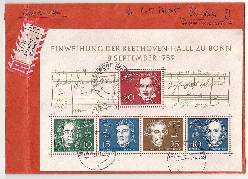 Hier ein Beethoven-Block als EF auf Einschreiben MARKDORF . Ob portogerecht kann ich nicht sagen. Zumindest ist ein guter Stempel drauf und ein weiterer beweist dass der Block schon auf dem Brief war als gestempelt wurde. ![]()