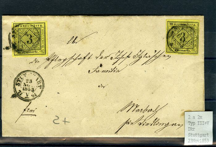1. Brief in der 2. Gewichtsstufe von Stuttgart nach Marbach frankiert mit 2 unterschiedlichen Typen Michel Nr. 2