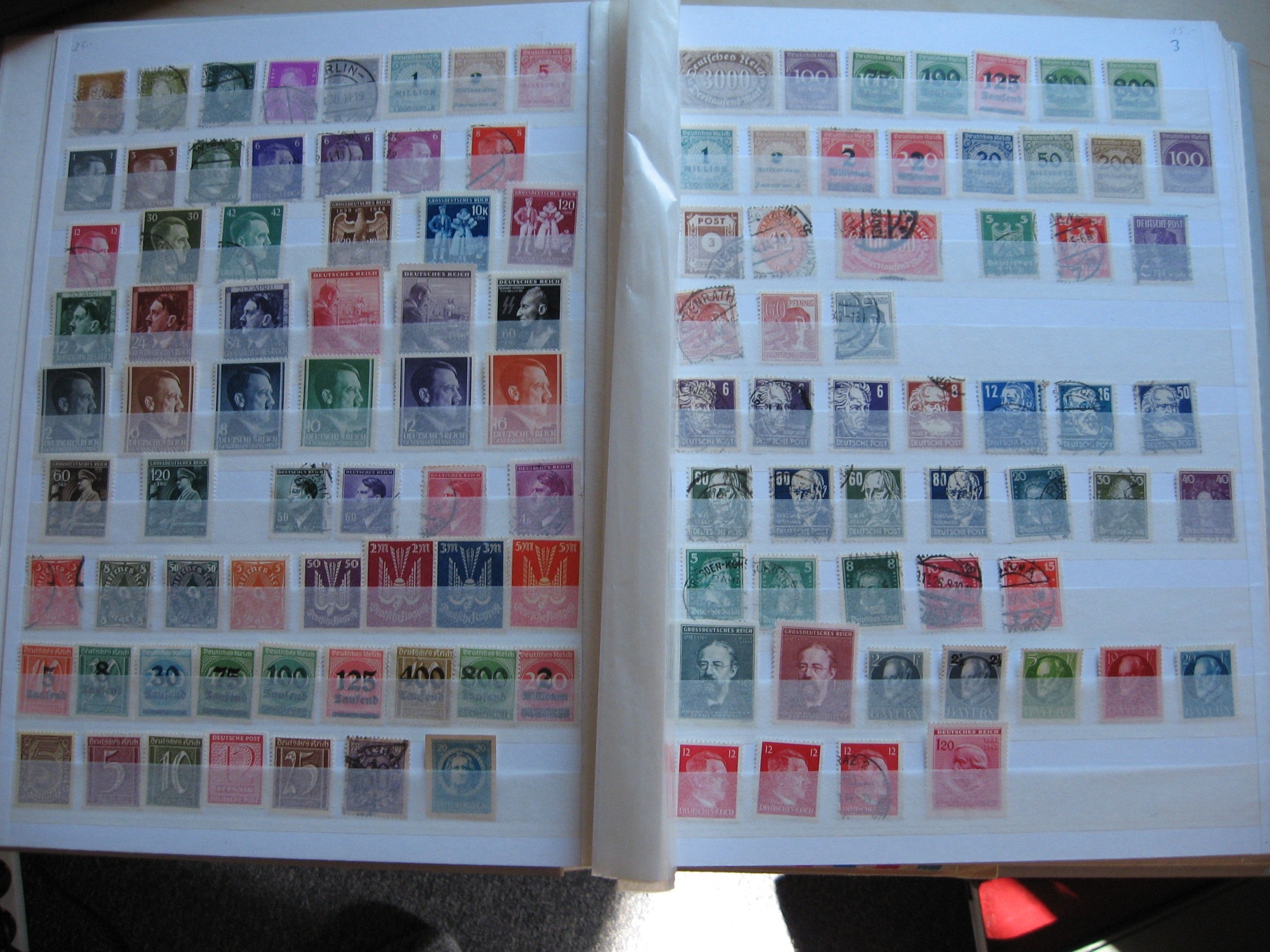Ich habe mal Bilder gemacht von ein paar Seiten der Sammlung. Da ich davon ausgehe, dass neuere Standardmarken nicht viel Wert sind, habe ich nur die alten fotografiert. Und auch erstmal nur die deutschen. Er hat auch ähnlich alte Marken aus den Niederlanden, Frankreich, Portugal, Finnland und so weiter. Fängt alles so etwa bei 1900 an, wenn ich die Poststempel richtig entziffert habe.