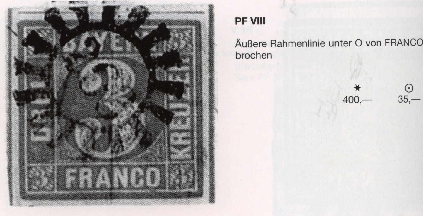 Die Kerbe im R bei Drei ist nur ganz schlecht zu sehen; Die unterbrochene Randlinie unter O von Franco dafür klar.