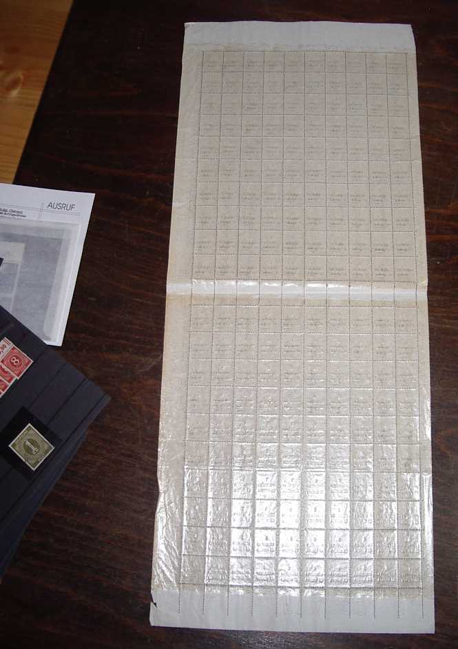 So war dort auch ein Bogen aus obigem Gebiet, und zwar ein unzertrennt gebliebenes senkrechtes Bogenpaar mit dazwischenliegendem kompletten gezähnten Leerfeldern in Markengröße. Das Bogenpaar ist logischerweise in der Mitte der Leerfelder gefaltet aber absolut postfrisch, was bei diesen Marken wohl ungewöhnlich ist, da im MICHEL nur mit Falz notiert.