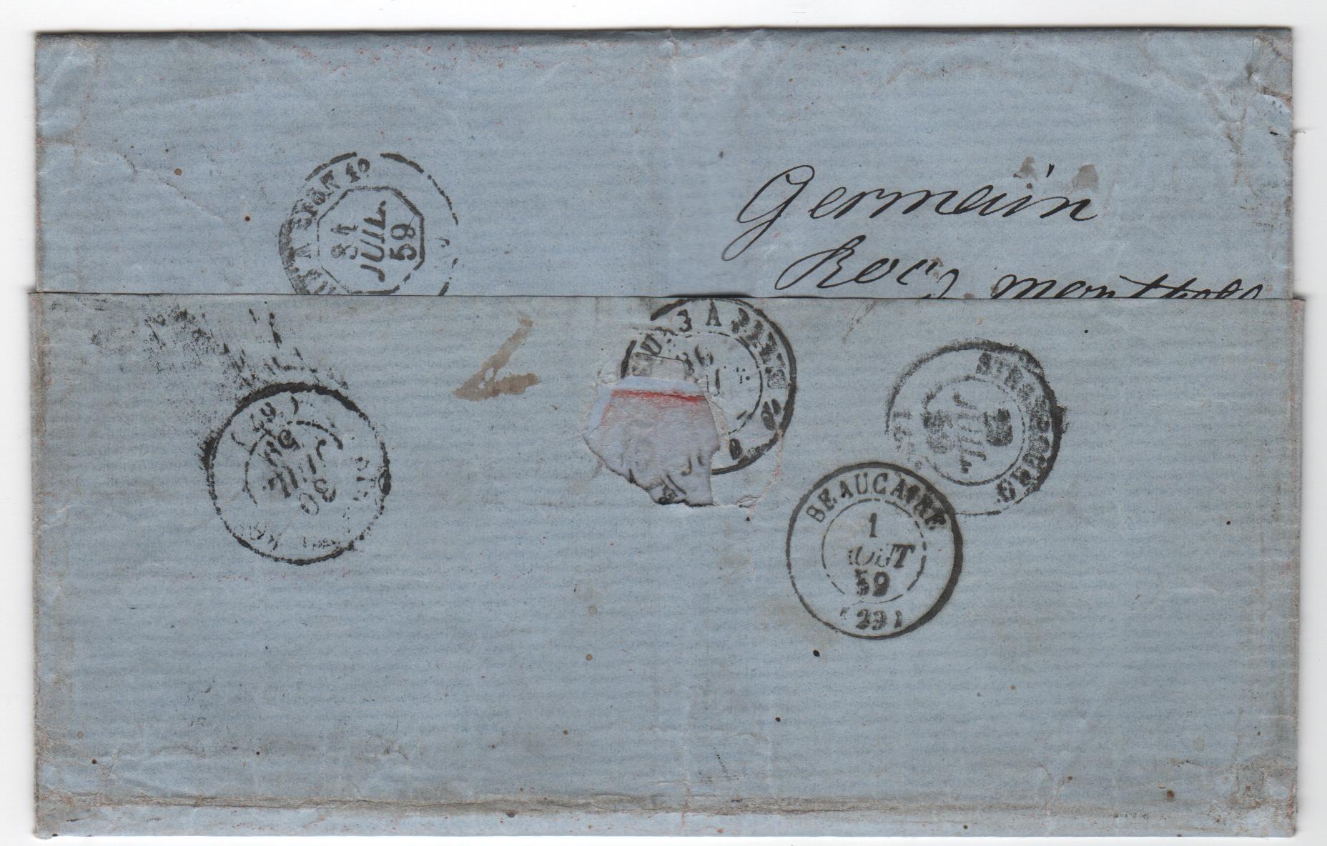 Ich möchte Euch 2 Briefe der Korbwaren Fabrik Georg Krauss aus Lichtenfels / Bayern nach Strasburg zeigen welche nach Beaucaire weitergeleitet wurden. Bei dem Brief vom 18.Juli 1859 handelt es sich um eine Rechnung und bei dem Brief vom 28. Juli 1859 um einen Brief privaten Inhalts an den Bruder des Fabrikanten Krauss. Beide Briefe tragen als Aufgabestempel den Halbkreisstempel in Antiqua mit (Schluß)punkt von Lichtenfels. Ich habe nun leider (noch) keine Ahnung bezüglich sämtlicher Vermerke auf den Belegen und bitte euch mir diese Belege zu erklären.