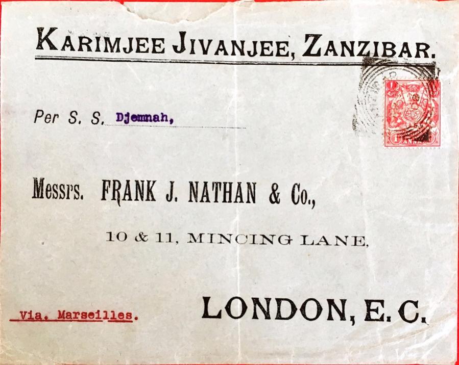 Brief mit Firmenvordruck Karimjee Jivanjee, Zanzibar. Der Brief wurde mit einer Frankatur von 1 Anna mit Lochung am 27. April 1908 von Zanzibar nach London geschickt (Ankunft 16. Mai 1908).