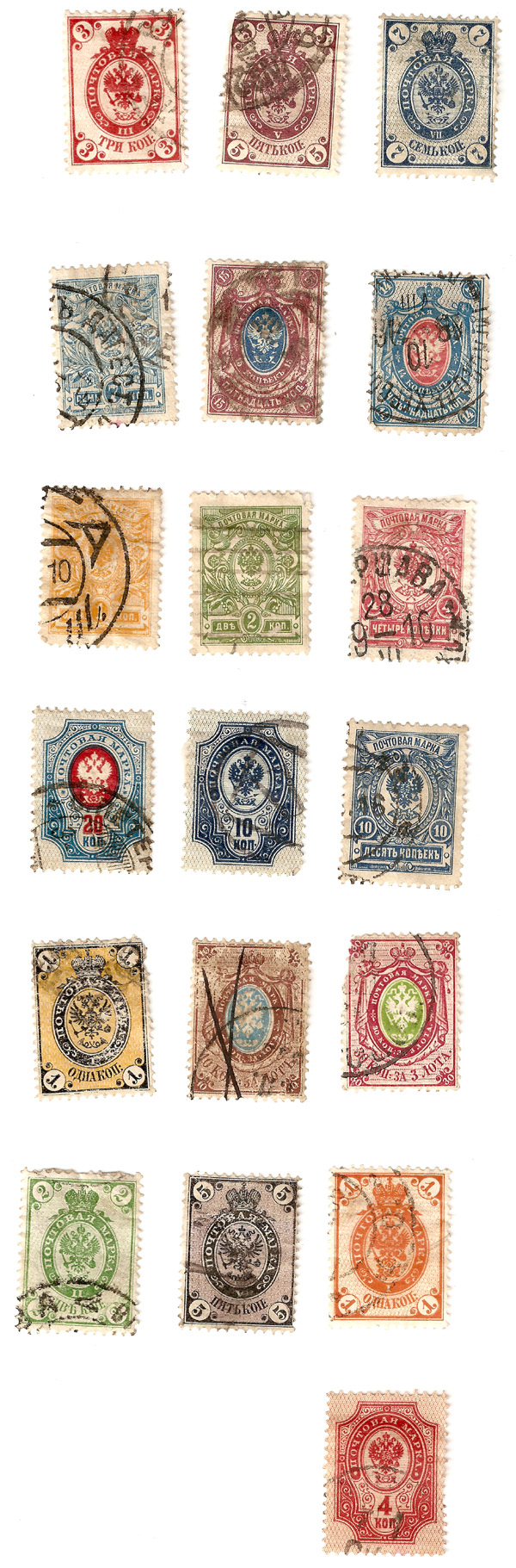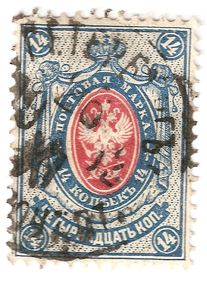 MiNr. 15 oder 21 (Papier ohne und mit Struktur (senkrecht und waagerecht) guter Stempel, auf den ersten Blick würde ich sagen Bahnpostwagen No.14 (St.Petersburg - Warschau).