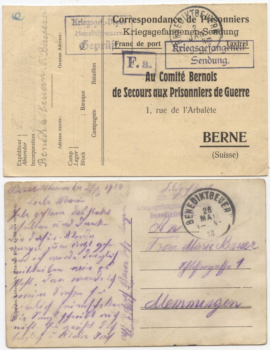 noch als Ergänzung zum Beleg von Peissenberg: Vom Kriegsgefangenenlager Benediktbeuern findet man nur wenige Belege. Das ist kein Wunder, denn es waren nur ca. 200 Kriegsgefangene dort. Hier zwei Belege: vom 2. Januar 1916 nach Bern (Schweiz) und eine Ansichtskarte mit Stempel "Kriegsgefangenenlager Benediktbeuern" vom 26. Mai 1918, nach Memmingen.