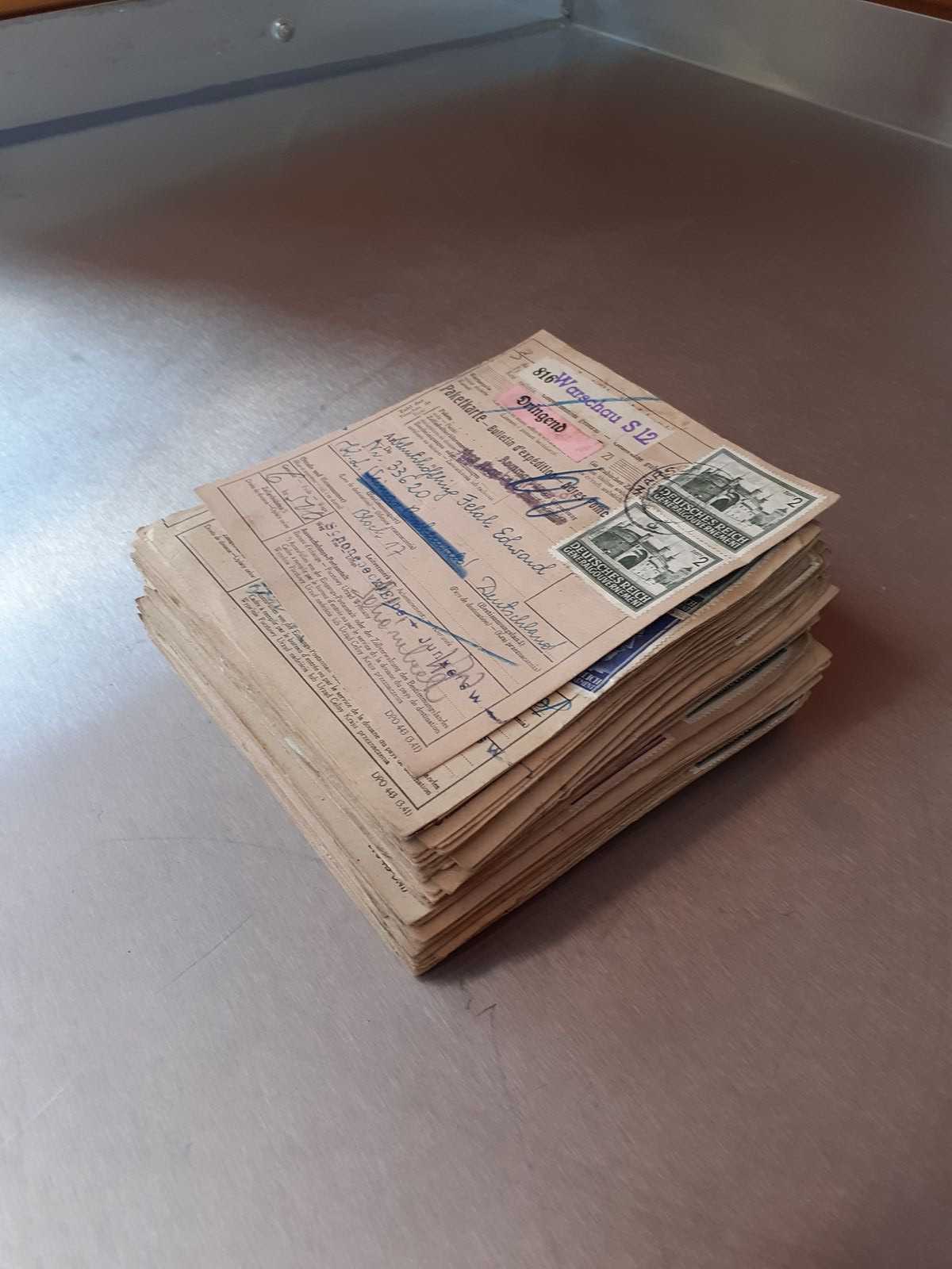 Wende mich mal wieder an euch da ich derzeit mit dem Rücken ander Wand stehe. Habe durch Zufall einen Stapel Paketkarten geschenkt bekommen und daran keinerlei Interesse. Habe sie mir mal heute in Ruhe angeschaut und festgestellt das alle Karten in das Konzenmtrationslager Buchenwald als Zielort eingegangen sind. Nun meine Frage an euch, gibt das dafür überhaupt einen Sammlermarkt und was hat soetwas Wert? Ich habe mal von 4 Stück Foto gemacht. Hoffe auf Aussagekräftioge Informationen von euch. Bin gespannt