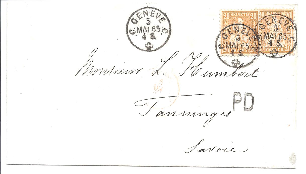 ein schöner Beleg. Auch von mir einer mit der 20Rp-Marke, in dem Fall gleich zwei davon in die Haute-Savoie (Frankreich, wieder seit 1860). Ein einfacher Beleg, aber schön gestempelt.