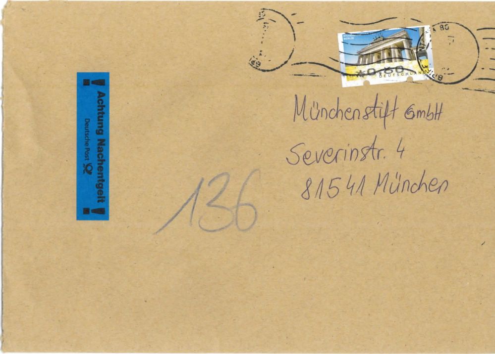 Heute in der Post: Großbrief mit 60 Cent frankiert, Rücksendung am Absender nicht möglich (nicht angegeben). Hinweis auf Nachentgelt durch blauen Aufkleber "! Achtung Nachentgelt !".