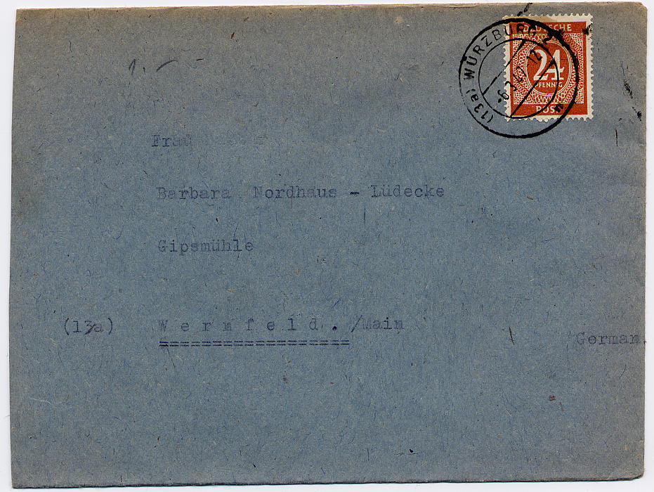 Und gleich noch einen besonderen 10-fach Beleg, den ich erst kürzlich von der Farbprüfung zurück bekam. Es handelt sich um einen einfachen Fernbrief und ein Teil der Marken wurden auf der Rückseite angebracht. Er wurde am 21.6.48-20Uhr abgestempelt. Aber dieser Beleg hat es in sich, denn er wurde vorderseitg mit 7 Marken der Mi-Nr. 946b frankiert.