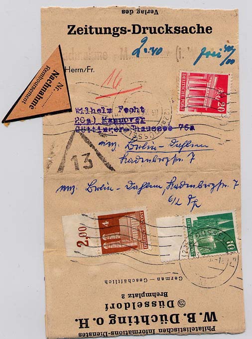 ich habe in einer Bauten-Belegesammlung einen Beleg gefunden, mit dem ich Probleme habe. Es handelt sich dabei um einen Streifbandbeleg Zeitungsdrucksache per Nachnahme. Im Michel Briefe-Katalog 2008 steht unter der Rubrik Zeitungsdrucksachen folgender Satz: Außer Luftpost waren keine Sonderdienste zugelassen. Wie kann solch ein Beleg dann zustande gekommen sein? Ist so etwas eine prüfwürdige Besonderheit oder eher ein Zufallsprodukt?