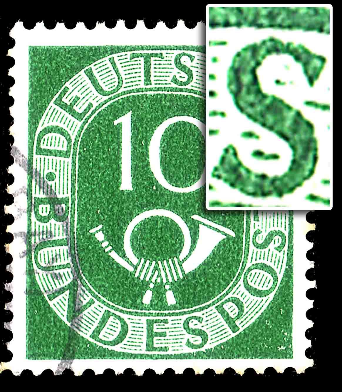 ich möchte Euch eine Abart der 10Pf Posthornmarke zeigen und würde gern wissen, ob das gebrochene "u" von "Deutsche" bereits bekannt ist und ob das für Posthorn-Sammler interessant ist ?(.