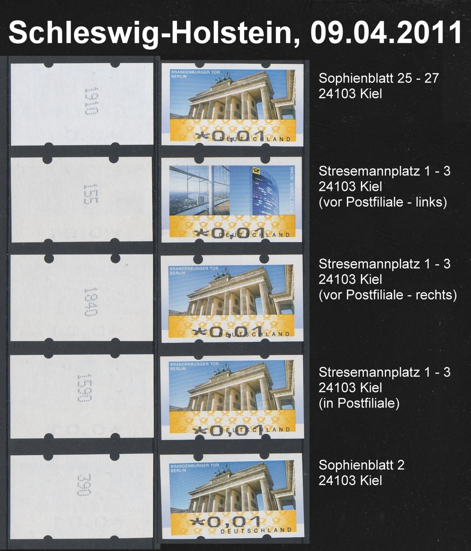 Ich selber hatte immer Glück gehabt, dass alle meine Vorlagen mit ATM-Fehlverwendungen in Bonn und Berlin bei den Stempelstellen (auch deutlich vor dem 01.04.2011, aber nach dem 01.09.2009) wunschgemäß gestempelt worden sind. Gleiches gilt auch für meine Vorlagen bei Erlebnis-Briefmarken-Teams in Kiel, Hamburg, Barmstedt, Rendsburg und Bad Bramstedt.