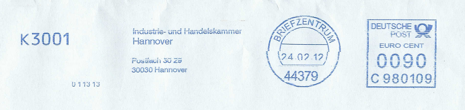 und zur Konsolidierung heisst es weiter "Bis zu 180.000 Drucke täglich und 12 Mio. Drucke jährlich bereiten wir auf unserer Poststraße für die IHKs zum Versand vor. Davon versenden wir selbst 2,5 Mio. Postsendungen mit einem Portoaufkommen von knapp 1 Mio. Euro pro Jahr. Dank besonderer Post-Abkommen können die IHKs mit der IHK-GfI ihre Portokosten um bis zu 27% senken.". Das erklärt auch, dass Briefe von IHKs aus dem gesamten Bundesgebiet AFS (hier C980109) aus Dortmund tragen und die Konsolidiererkennung K3001.