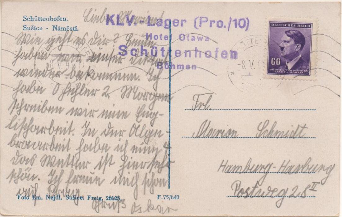 u. a. diese Karte vom 8.5.1943 von Schüttenhofen in Böhmen nach Hamburg mit dem sauber abgeschlagenen Stempel KLV-Lager habe ich in einem Posten bekommen.