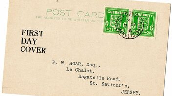 Auf der Briefmarke steht "Guernsey Postage" mit dem Wert "1/2 d". Es sind zwei Briefmarken nebeneinander.