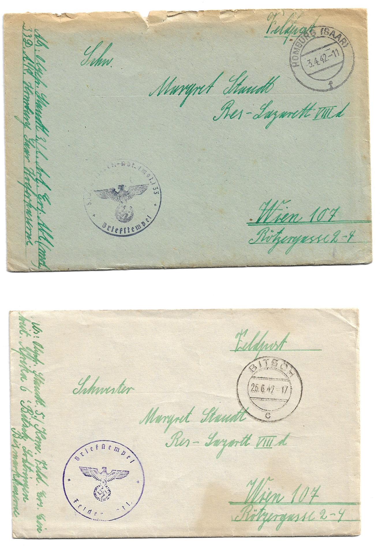 2 Feldpostbriefe des selben Absenders jeweils an die selbe Adresse.