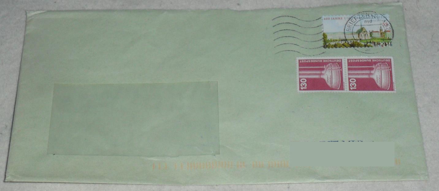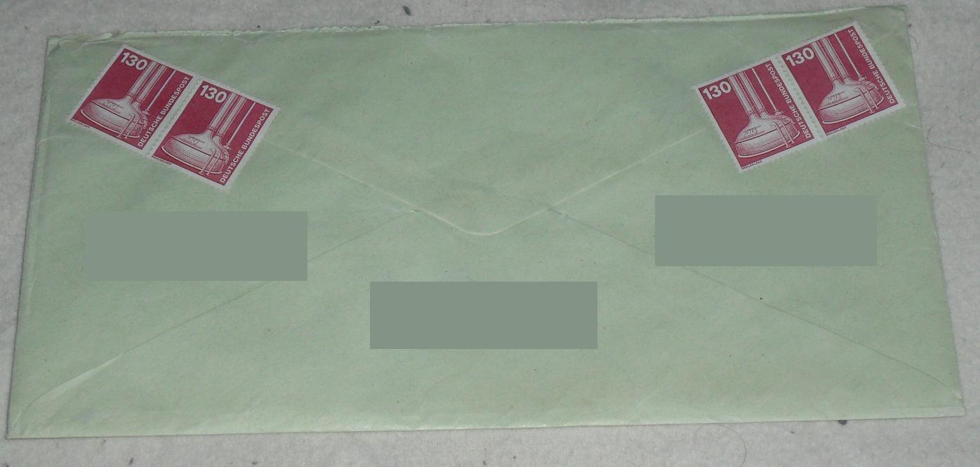 Trotzdem habe ich ein Beispiel wie ein, finde ich zumindest, guter Stempel aus dem Briefzentrum kommen kann. Überrascht war ich, das in der Postkiste noch 2 weitere Briefe fand, selber Umschlag, selbe Marke und selber Stempel, aber unterschiedliche Absender. Und ein nicht gestempelten Block, den ich heute gefunden habe. -
