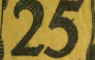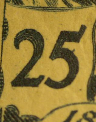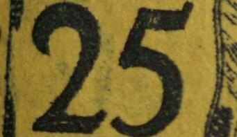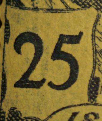 Den 25 Cts Wert der nachgravierten Platte (Typ 3) erkennt man am einfachsten dadurch, dass die Zahlen im Wertschild mit parallelen Strichen gezeichnet ist. Meist sehr gut erkennbar, im Bogen der 2, mit einer Lupe mindestens 10Fache Vergrösserung.