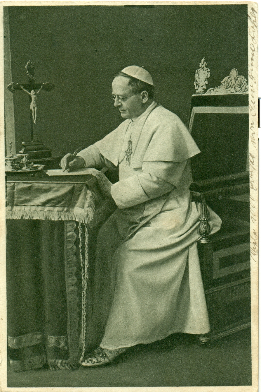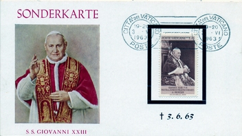 Auf dem Bild ist der Papst bei seiner Ankunftsrede zu sehen. Unten in der rechten Ecke ist der Kölner Dom zu sehen, welcher natürlich auch auf dem Stempel zu sehen ist.