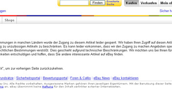 Ich musste eben feststellen, dass es wohl im Ausland (zumindest UK) nicht mehr moeglich ist, bestimmte Artikel auf Ebay Deutschland einzusehen. Keine Ahnung, ob das nur voruebergehend ist. Ich vermute, es handelt sich hierbei um Angebote, die nicht die Paypal Option enthalten. Jedenfalls bekamm ich beim Anklicken von solchen Angeboten die unten abgebildete Mitteilung.