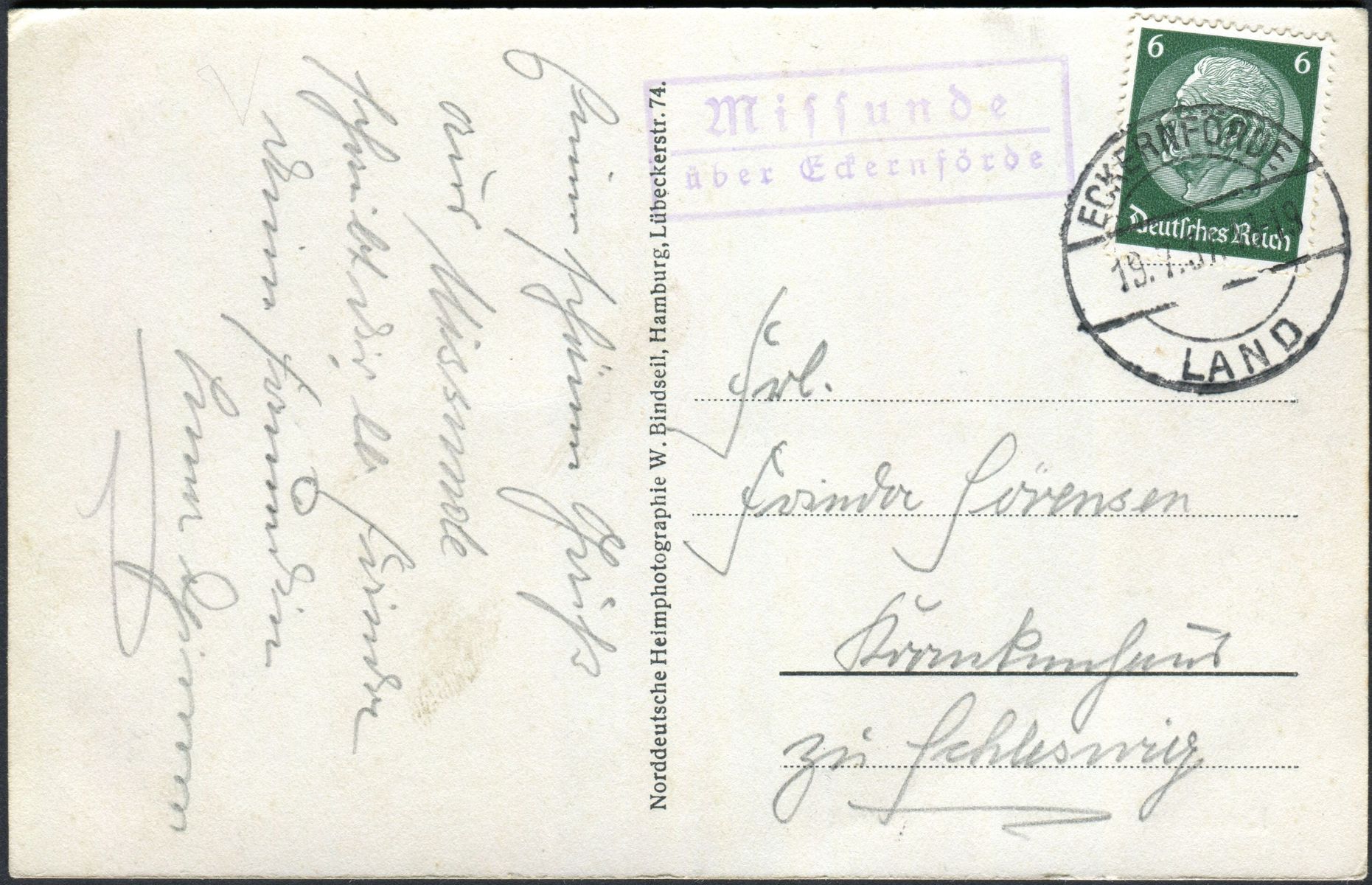 ich zeige heute eine Postkarte aus Missunde (Stempelabschlag) bzw. Kosel (Motiv) nach "...? zu Schleswig" (wie ich zu lesen glaube, hier würde ich mich über Ünterstützung freuen ;-)) aus dem Jahr 1937.