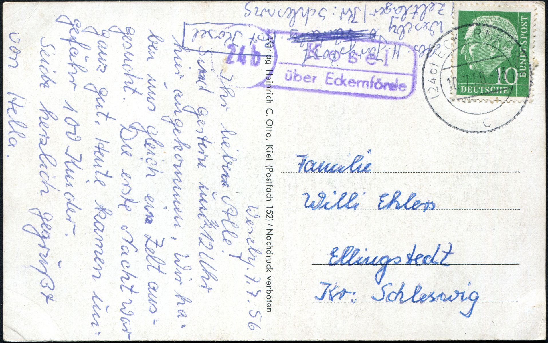 Der Halbspatelstempel "(24b) Kosel über Eckernförde" ist links neben der Marke abgeschlagen, die 10 Pfg. Heuss Marke wurde mit dem Zweikreisbrückenstempel "(24b) Eckernförde 10.7.56 – 13 c" entwertet.