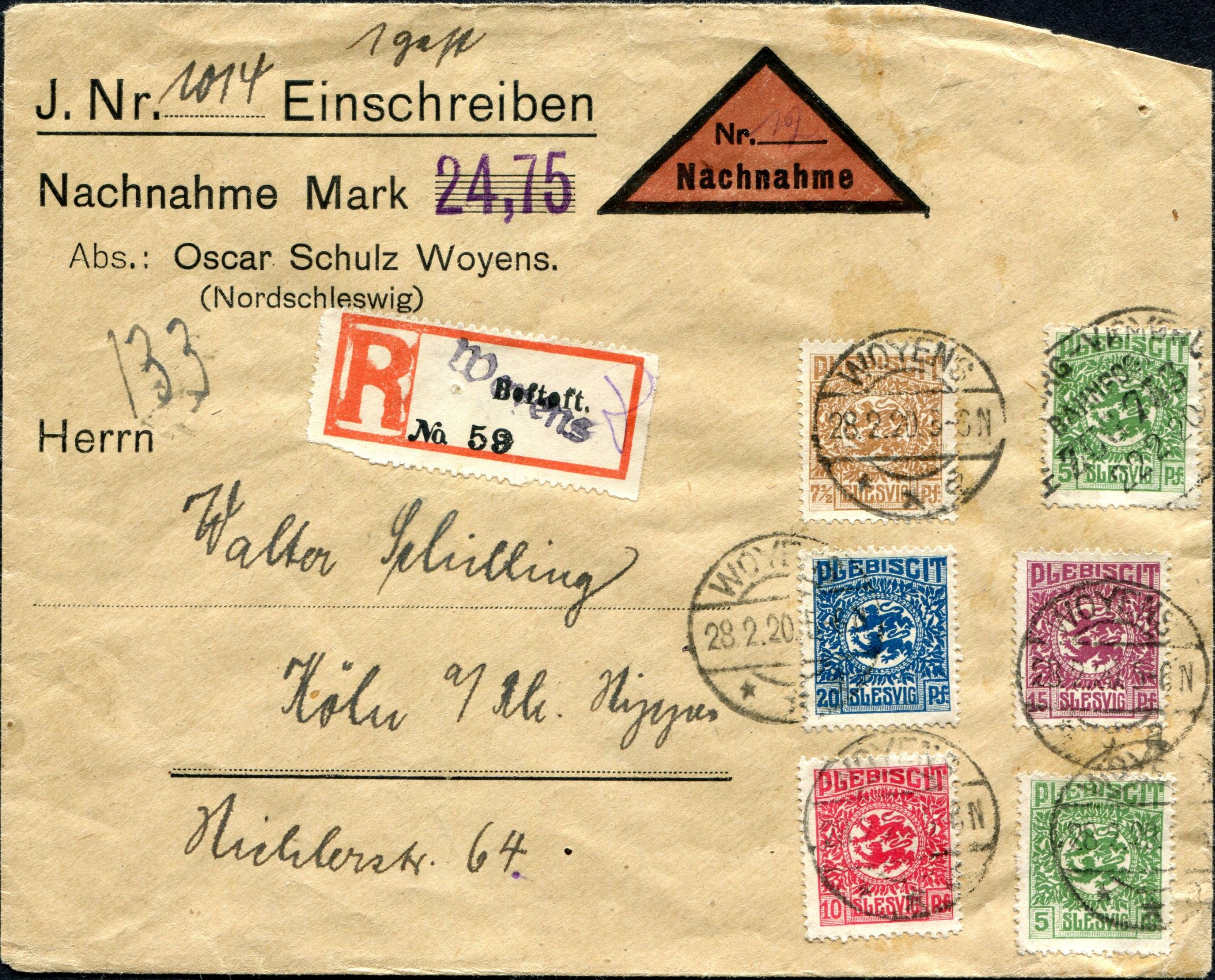 Der einfache Brief bis 20 g kostete 20 Pfennig, dazu kamen 30 Pfennig für das Einschreiben, dazu die Nachnahme, welche weitere 25 Pfennige erforderte, insgesamt demnach 75 Pfennige, so dass dieser Brief mit 12,50 Pfennigen zu wenig frankiert worden wäre, jedoch scheinbar ohne Beanstandungen befördert wurde